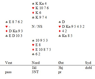 Vil ikke 4 hjerter med 10 stikk være å foretrekke? Den bør vel kanskje vinnes med den aktuelle sitsen: Hjerter Ess i stikk 2, ruter til røff og 3 ganger hjerter inn med Syd. Han kan ikke gjøre noe bedre enn å spille en kløver igjennom, hvoretter Nord frir seg med det som vel må være hans siste ruter (han har jo allerede måttet kaste 3 kort). Vest trumfer med sin nest siste trumf og spiller spardamen som han forventer at Nord dukker, og planen er å fortsette i spar hvoretter Nord er innspilt. Men nå må Syd stikke spar Dame og Vest har enkelt resten på en show-up skvis mot Nord. Burde vel være mulig å få til ved bordet? Spillefører må ikke røre sparen før all trumfen er ute, for hvis motparten tar en sparstjeling (med orginalstikket) er bordet dødt. Masse hilsener Leif-Erik