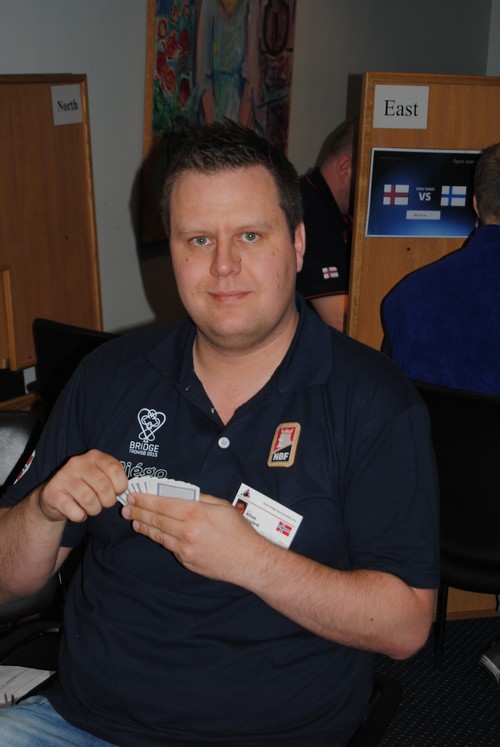 synes jeg. 3ru viser singelton, og resten er naturlig med sleminvitt i kløver og to majorcuebid. Dette meldingsforløpet ser profft ut, men i mine øyne er det skrekkelig. Hva er vitsen med å hoppe til 3ru for å vise kortfarge når makker melder 3NT med Exxx? Gi øst f.eks Exx,EKx,x,Dxxxxx og han vil normalt passe 3NT. Det er beit så det suser i 3NT med ruteren 5-3 og kløverinntak på langhånda. 6k ler en god kontrakt som står på å ikke få to kløvertapere. 5kl er en mye bedre endestasjon enn 3NT i alle fall, og dit bør det være mulig å komme etter 1NT - 3ru. Gi makker f.eks Knxx,KKnx,x,KDKnxxx, så passer han også 3NT. Kabalbeit, mens 5kl er nedlegg. Gi vest denne hånda: KDx,KDKn,Exxx,Knxx og meldingsforløpet går akkurat likedan fram til 4sp. Da mangler vi EK i trumf i 6kl! I praksis har dette meldingsforløpet i mine øyne gått 1NT - 6kl. Her må det arbeides med å differensiere. En jobb å ta tak i Christian Vennerød!! Jeg synes altså at Thor Erik melder steintøft, nesten grisete. 4kl er greit nok, men så kan ikke makker gå på med Blackwood over 4hj. 4sp er "Last train" og viser normalt sparkontroll, men ikke nok kort til å spørre etter ess. Da må da 5kl holde i masse? 6kl står med kongen singel i syd, men her mangla det rett og slett en honnør. Masse bra, men i det siste spillet er det mye å hente for alle par i landslagsdiskusjonen. (oss andre også). Joda, jeg er den første til å innrømme at å analysere store spill når en ser alle kortene, er litt urettferdig. Ved bordet må en noen ganger bare dra en kanin opp av hatten, men som jeg sa lenger opp i artikkelen handler bridge om å gjøre ting som betaler seg i sum over tid. Da er det gode vurderinger, godt system og god kommunikasjon som gjelder. Noen ganger må en bare gjette, men mitt inntrykk er at norske toppspillere gambler for ofte. Vet en ikke hva som er rett, er jeg rimelig sikker på at en safe aksjon er det som lønner seg i lengden.