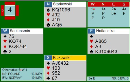 Det er ikke tvil i min sjel om at akilleshælen for å gå videre i det kommende EM, er slemstatistikken. I lagbridge er det i meldingene kampene avgjøres og da først og fremst i de store spillene. I forrige mesterskap var jeg kritisk til de norske prestasjonene på seks- og syvtrinnet og i Nordisk var det også en god del rusk. Hva så med slemmene i Polen? Under finner du de fleste av de store spillene og jeg synes det var mye bra. Ikke alle parene som var med er like samspilte, så det får være med i betraktiningen. Jeg er klar over at bridge i etterpåklokskapens lys er en lett øvelse, men det er også et faktum at over tid er de beste spillerne de beste. Også i slemsonen. 1: 6NT av Hegge - Grude 4NT fra Kristoffer Hegge er ikke Blackwood, men en naturlig invitt. Han har seksten poeng mot makkers 15-17 og tar han med på råd. Selv med sytten og femkort spar er ikke slemmen mer enn omtrent 50%, så et fint meldingsforløp. Gi nord spar åtte, og kontraken er plutselig godt bedre (tåler flere 4-2 sitser). De parene som ikke spiller hopp til 4NT i slike posisjoner som invitt, er tvunget til å gjette. Kanskje skulle syd undersøkt om makker har fire ruter, fordi 6ru kunne godt vært den eneste vinnbare slemmen. 2: FIN MAJORSLEM AV HOFTANISKA - SÆLENDSMINDE 3hj viser bedre kort enn 4hj, og 4kl over 3sp er jeg ikke sikker på. Noen spiller at 3NT i slike posisjoner viser en seriøs sleminvitt i hjerter, mens 4kl bare en cuebid og forteller ingenting om ekstra tillegg, kun kløverkontroll. Ruteren kunne vært skummel for Hoffa, men han kunne nesten ikke legge seg under 6hj nå. En nesten 100% slem som ikke ble meldt ved det andre bordet. 3: DETTE LIKTE JEG OGSÅ Fra Thor Erik sin side i øst kunne det stå masse i dette spillet, men motparten har tatt fra all plass til å undersøke. Da legger han seg forsiktig i det han vet er en spillbar utgang. Det kan se ut som 6ru står på det andre bordet, men Tor Eivind Grunde spilte ut spar til stjeling i bordet. Så hjerter til kongen og kløver mot bordet. Opp på esset og mer spar. Bordet måtte stjele med esset og nå ga ruter 9(!) beita. Fint motspill og litt heldig norsk sving. Legg merke til at Hoftaniska i øst ikke dobler negativt over 1sp for å vise hjerteren, men melder naturlig av sin lengste farge. En god vurdering, synes jeg, fordi 7-4 hender skal veldig ofte ikke spille på 4-4, men med syvkortfargen som trumf. (ikke denne gangen) Han hadde nok håpet å få komme tilbake for å finne evt. hjertertilpass, med den gang ei. 6hj kan vinnes greit med spar ut til stjeling. Hjerter til kongen, spar til stjeling, hjerteress, hjem på ruterkongen og ut med trumfen. Kløveresset er alt motparten får. Med f.eks ruter ut, kan kløveren også godspilles. 4: LITT GJETTVERK Noen gangen er det nesten umuulig å finne ut hva som står. Da kan det være like greit å hoppe ut slik Kristoffer Hegge gjorde. Kanskje mangles EK i kløver, men det kan være at kontrakten står uten den fargen ut. Da er det ikke noe vits i å sladre, fordi 5kl kan jo også være beit hvis 6 ikke står. Trumfen kan være for dårlig, men 7ru kan også være å slenge i veggen. Grei sats fra Snåsa og innertier når kløverkongen ga det tolvte stikkek med esset foran. 5: DETTE ER DET MEST INTERESSANTE SPILLET