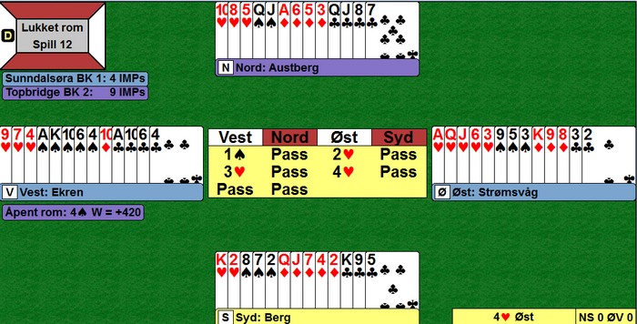 Jeg kommer til å oppdatere rundene etter hvert som jeg får/finner spill. I år er jeg ikke tilstede og trenger derfor noe mer tid til å skrive om gode, dårlige, morsomme og heldige spill. Som alltid er jeg glad for innspill fra dere lesere. SLUTTRESULTAT - 3.KAMP Vi legger merke til Heimdal 1 sin store seier over Arendal, mens Sunndalsøra slo hardt tilbake mot Topbridge i andre halvrunde. Voll - Kindsbekken hadde over +52 IMP på Butleren mot Berg - Austberg på de 16 spilla. Ellers vinner Ski stort som forventet mot hjemmelaget og har tatt en god ledelse. RESULTATER FØRSTE HALVRUNDE 3.KAMP Nå er jeg på tynn is, men har det vært damespillere som har vunnet NM klubber tidligere? I tilfelle det ikke har skjedd, ville det vært hyggelig om Siv Thoresen ble den første. Ski har tatt ledelsen, men etter 2,5 kamper er det tett mellom båtene. Arrangørlaget viser nok en gang at de nok ikke holder nivået, men det er så viktig at noen legger sin sjel i arrangmentet at belønningen med plass i finalen tror jeg vi skal fortsette med. I morgen tidlig spilles andre halvrunde av tredje kamp. Det kommer til å bli omrokkeringer utover morgendagen. BEGRENSA VALG MED BEGRENSINGER Steinar Ekren kan sin bridge ABC og gikk derfor en beit i denne kontrakten. Han fikk ruterdamen ut til esset og skift til kløverdamen til esset. Hjerter til kapp og syd vant før han tok et kløverstikk. Nå hang dette på å spille sparen tapsfri. På BBO står det ikke hvordan han spilte, men jeg er rimelig sikker på at han la ned sparesset og så en honnør fale. Nå sier regelen om begrenset valg at det er dobbelt så stor sjanse at nord ikke hadde noe valg når han la honnøren sin og at den derfor er singel. Var han utstyrt med DJ dobbel opprinnelig, kunne han like godt lagt den andre under esset. Derfor inn øst og spar til tieren for ei beit. Hvorfor vant Topbridge dette spillet da? Kan ikke Johny Hansen sin teori? Jo, det er fordi at på hans bord var spar trumf. Motparten satte opp et kløverstikk i utspillet. Så tok Johnny hjerterkappen som sprakk og hadde de samme tre taperne som på det andre bordet. Nå la han ned trumfesset og en honnør falt bak. Så kommer poenget. I sparkontrakt er det ikke noe vits å spille på damen eller knekten singel i nord, fordi da vi syd ha H872 og vil alltid få et stikk. Derfor "må" DJ sitte dobbel for at 4sp skal kunne vinnes. (En annen sak er at jeg er rimelilg sikkert på at DJx i syd er større sjanse er DJ dobbel i nord, og at derfor er teoretisk beste plan å ta dobbelkappen. Det ville gikk beit denne gangen. Det er et lite forbindelsesproblem som gjør at oddsen for DJx vs DJ påvirkes)