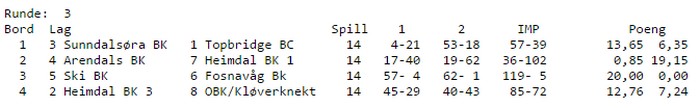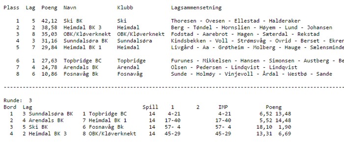 Jeg kommer til å oppdatere alle rundene etter hvert som jeg får/finner spill. I år er jeg ikke tilstede og trenger derfor noe mer tid til å skrive om gode, dårlige, morsomme og heldige spill. Som alltid er jeg glad for innspill fra dere leser BBO-kampen var mellom de to Heimdalslagene og i første halvrunde var det spill mot et mål. Erik Berg og Børre Lund spiste Aa-Livaard levende på det ene bordet og på det andre var også Hornslien - Høyem bedre enn Grøtheim - Molberg. Det kommer noen spill.
