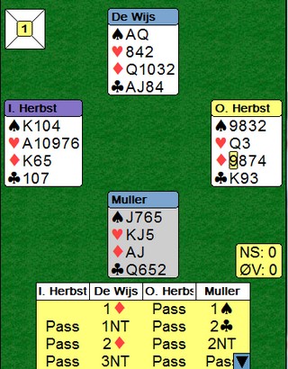 Jeg har vel skrevet snart hundre ganger om at jeg mener invittutspill mot NT er overlegent bedre enn fordelingsutspill. Makker må kunne vite om du spiller aktivt ut fra en god farge eller om utspillet er på jakt etter makkers styrke. I tillegg liker jeg ikke å bruke nieren fra indre sekvens. H98xx spiller jeg ut den lille, selv om det en av tjue ganger kan gi bort stikk når tieren er i bordet. Fra den pågående treningskampen mellom Israel og Nederland. Øst spilte ut ruter 9 til knekt og konge. (1ru --> 2+). Hvis nieren kan være fra D98xx, så skjønner jeg at vest fortsatte fargen. Jeg spiller hjerter tilbake fordi jeg vet at spillefører har ruterfargen. Det kom ruter åtte ut på det andre bordet. Knekt og konge. Her visste vest at makker ikke hadde ruter, så han skifta pent til hjerter til makkers dame. Men den israelske spillføreren (Liran), kan sin ABC og dukket hjerterdame. Da stod det 3NT likevel. Pent.