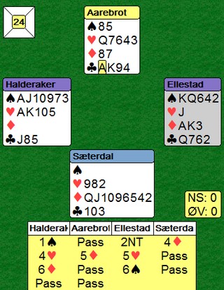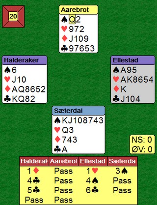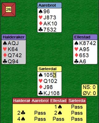 Bernt_Ivar satt øst og åpnet med 1 kløver. Syd hoppet inn med 2 hjerter og