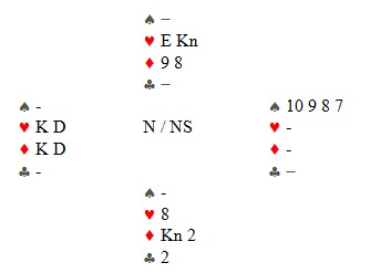 fordi han har kommentert dette spillet som jeg skreiv om for noen dager side. Terje Aa melde 6kl og fikk ruter ut. Nå påstod jeg at 6kl kunne vinnes med hjerter ut, men var beit med ruter i start. Niks, sier Martin Reinertsen. Martin forteller at han spiller slik. Stikker med ruteresset og tar for spar kongen. Så kløver til kongen og på sparesset kastes en hjerter. Nå er det klart for fem ganger trumf til og stillingen før den siste er slik: Den siste kløveren og du ser at vest er ferdig. Han kan ikke kaste hjerter fordi da står bordets EJ. Derfor må han kaste ruterdamen og da forsvinner hjerterknekten i bordet. (Vest kan godt ha en spar i posisjonen over, men da må den kastes nå). Når vest sitter igjen med singel ruterkonge, spilles "bare" en ruter fra hånda og spillefører vinner de to siste. Dette ser kanskje litt skrivebordsaktik ut, men faktisk ikke umulig å klarer for en spiller av Terje Aa sitt kaliber. At vest skal ha KD i begge rødfargene er vel til og med nesten sannsynlig etter meldingsførløpet. _______________________________________________________________________