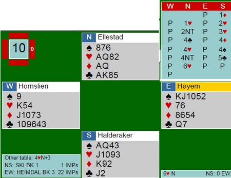 Det er lett å bli etterpåklok når en skal skrive om spill. Dette spillet er kanskje et slikt, men det viser i alle fall at kommunikasjonen mellom Olav Ellestad og Bjørnar Halderaker er på plass. Det kan se litt underlig ut av syd å gå på over 4hj med en minimumsåpning, men poenget er at den er allerede vis med 3hj. Selv da var makker sleminteressert og Bjørnar vurderte sine mellomkort i trumf til å være viktige, det samme med ED i spar og ruterkongen. Det stemte og kontrakten var rett så fin. Det stod i praksis på en av to finesser, og når begge gikk var det tretten stikk. 11 IMP i gevinst mot 4hj +510 på det andre bordet. _____________________________________________________________________