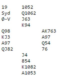 "Hva tror du jeg spilte ut fra nord? Joda, kløver 10. Da var i praksis spillefører sjanseløs." ______________________________________________________________________ Legg merke til at det står 4H Ø -620 under selve spillet. Det er en doubledummy analyse som ligger i regnskapsprogrammet. Programmet kan ingenting om bridge, annet enn det kjenner reglene for å følge farge, hvem som spiller først i neste stikk, kortenes rang og hvordan trumfen kan brukes. Programmet spiller kortene i alle mulige lovlige rekkefølger (mange millioner varianter) og teller stikk. Den høyest, teoretisk mulig scoren for en av sidene vises. Jeg har enda ikke opplevd å ta programmet i feil og når det står at det kan vinnes ti stikk i hjerter, er det garantert korrekt. Årsaken til at det står 4hj, er at etter to sparstikk kan ikke motparten skifte trumf for å hindre ruterstjelinger. Da tar spillefører enkelt ut trumfen og henter resten via kløverkapp. Med skift til kløver etter to ganger spar, kan det stjeles to ruter i bordet, med overgang til hånda via kløverstjeling. Syd har 109xx og kan ikke hindre at hjerteråtte kommer med i spillet. Da blir det 0 + 7 + 1 + 2 = 10 _____________________________________________________________________