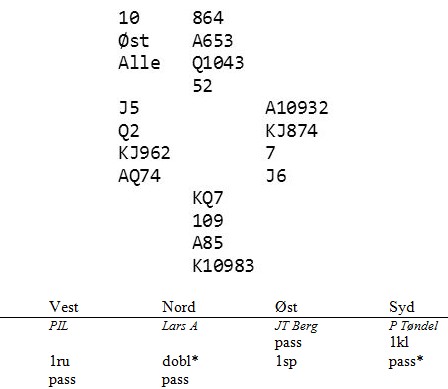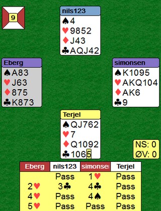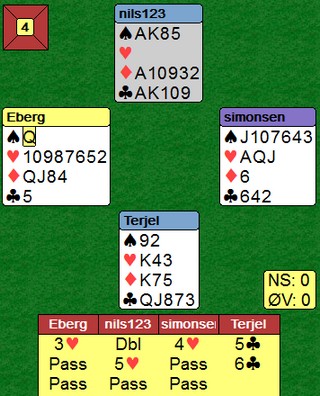 Godt meldt av Berg - Simonsen, men det ble en beit. Jeg vet ikke hva som er beste spilleplan etter EK i kløver ut, men den Erik valgte gikk i alle fall skeis. Han stjal tredje kløveren, ruter ess og ruter til stjeling. Så EK i hjerter og når Terje Lie stjal med sparkongen, ble det beit. Spar til esset etter ruterstjelingen, og så hjerter hadde gitt +620, men det er ikke sikkert det er en bedre plan.