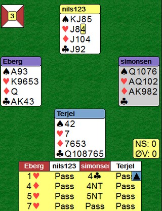 SPILL 3 Så en flott storeslem av Berg - Simonsen. 4kl viser renons og EK der var kanskje ikke det beste, men det er jo aldri noen ulempe med esser og konger, så fremt hånda ellers også er sterk. Erik stjal to to små kløverne i bordet og kasta to spar på EK i ruter. 13 stikk.