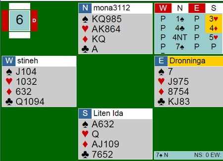 Spillet under ser ut som et lett spill der "alle" enkelt bør klare å komme til 7sp. I gårsdagens landslagstrening synes jeg ikke alle parene takla spillet helt bra. Nils og Terje hadde full kontroll, blant annet fordi paret så tidlig hvem som skulle gå i Blackood, nemlig nord. Flere par meldte likt et stykke, men på minst et bord gikk syd i Blackwood. Uansett hva makker svarer, vil han ikke kunne vite om det står storeslem. Det vil ikke være plass til å undersøke om de andre tre fargene er tapsfrie. Gitt at en ikke vil spille storeslemmer som står på en kapp, kan det meget godt være at ruteren må løses med f.eks Kxx mot EKn10x. Syd vil selvsagt kunne invitere til storeslem med både 5NT og kanskje også en farge på 6-trinnet. Se hvor mye bedre det er hvis nord melder Blackwood. Han trenger to nøkkelkort og kan få spurt etter tredjekontroll i hjerter. Helt uproblematisk, så derfor melder Nils i nord 4NT i stedet for å cuebidde hjerteren og "tvinge" makker til å melde 4NT. ________________________________________________________________ Ida og Gunn løste spillet på denne måten, der 3hj er singelton og sparstøtte.