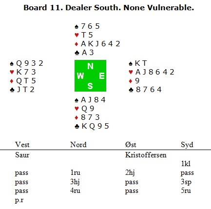 Det så ikke ut som motparten hadde hjerterhold og da startet Christer med en liten hjerter fra øst (!). Makker stakk med kongen og spilte syveren opp igjen. Spillefører fulgte med tieren, men det hadde han da fort gjort fra 1053 opprinnelig også? Christer ser at kløveren gir fire stikk og da ser det unektelig ut som det må en hjerterstjeling til for å beite? Derfor mer hjerter og hvis det er vest som har dobbel hjerter trenger han bare et kort større enn bordets ruter åtte for å beite. Ikke medsiin denne gangen og øst hadde i tillegg sladret i fordelilngen når han leverte dette motspillet. Det så ut som han ikke hadde noe ruterstikk der bak og da kappet spillefører opp makker Øyvind Saur sin ruterdame og -400 til utbetaling. Tenk deg om nord hadde hatt f.eks EKDKnxx i ruter, 10xx i hjerter og kløveresset (det siste har han alltid). Da hadde dette motspillet vært klart for pris og medaljer med krans og stjerne.