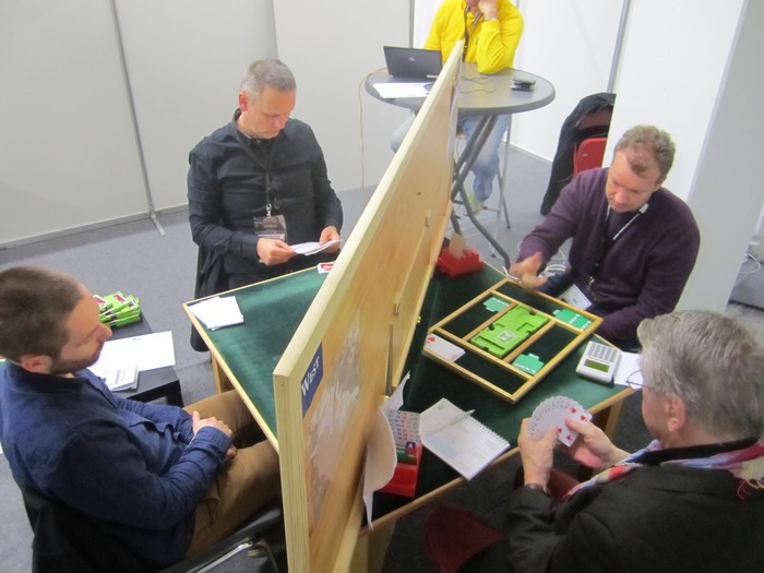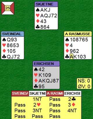 Første kamp på søndag var runde seks i kvalifiseringen. De to norske lagene som ligger best an på dette tidspunkter er Noralia (Sveindal og Arild Rasmussen med austrlske lagkamerater) og Erichsen (Espen Eriksen - Erlend Skjetne og Erik Berg - Steffen Fredrik Simonsen). Før jeg skriver noe fra kampen, ønsker jeg å berømme Erlend Skjetne for jobben har gjør med NORSK BRIDGE. Bladet blir bare bedre og bedre, ikke minst takket være Erlend sin penn. Han skriver levende og er kreativ i sin form. Alle best liker jeg når han tar den helt ut, sånn som da han fortalte i klare ordelag hva han mente om de medlemmene som ikke har tatt veien til Tromsø. Ironisk selvsagt, men med sting. Enda mer moro når debatten på FB tar fyr over at noen tør skrive mer enn God Jul og Godt Nyttår. Fortsett som du stevner, Erlend. De to første spillene var flate utganger som gikk ut. I spill 3 kom begge parene i 4sp med tre klare tapere i hjerter og kløver. Trumfen var tett, mens ruteren var EK32 mot Kn98x. Damen satt tredje foran EK, mens 10x var bak. Ingen av spilleførerne var inne på tanken om å ta for esset og så spille knekten. Uavgjort spill igjen og 0-0 etter tre spill. Spill 4 (24) var det første svingspillet og det var forsiktighet som ga en 5'er til Bergen. De to første meldingene var like, men Erik Berg hoppet til 3NT der Jon Sveindal bare meldte 2NT. 3NT kunne fint stått med f.eks ruteresset foran og at motparten ikke rakk å ta fire sparstikk. Det kom hjerter ut mot 3NT og Erik spilte ruter til kongen i stikk to. Det ble bare åtte stikk, mens Jon Sveindal fikk hele ti i 2NT etter ruterutspill. 6-0 til Noralia Spill 5 (25) synes jeg var en dårlig vurdeing av Espen Erichsen. Når makker åpner med 1NT, er han i slemsonen og det er helt ok å invitere over 3NT, men da synes jeg 4ru er bedre enn 4NT. Makker kan alltids gå ned i 4NT hvis det er der en skal være. Selvsagt uheldig at makker heller ikke hadde kløverhold, men 4NT med en beit var nesten fortjent. Heller ikke på det andre bordet fant NS den langt bedre hjerterutgangen (1NT - 3NT), men var heldig når kløveren satt 4-4. 17-0 til Noralia Spill 6 (26) var et spennende spill. Begge parene kom i 3NT, men 6kl er en fin kontrakt. I praksis vil en nok gå beit fordi en prøver først hjerter mot esset (for å kaste en ruter i vest). Når det ikke går, spiller en tre ganger spar og kaster ruter i bordet for så å stjele en ruter for det tolvte stikket. Syd har bare dobbel spar, går heller ikke den planen. Det går an å vinne 6kl, men det er nesten double dummy. (en eller to ganger kløver før en spiller spar, kanskje ikke umulig?)