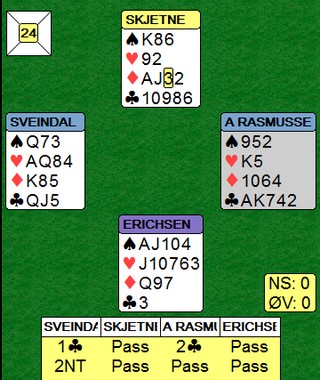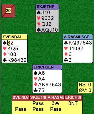For det var akkurat det Lise Blågestad var 99,9% sikker på at den gjorde. Hun hadde følgende kort. ED97632 E94 KKn6 - og var i 2sp doblet (!). Dette må da stå, tenkte hun, og var enda sikrere når makker hadde sparkongen! Kortene ser du under og selv med alle hendene synlig sliter jeg litt med å finne det åttende stikket etter kløver ut. Det går sikkert an, men jeg har ikke sett noen som fikk mer enn syv stikk i sparkontrakt. Jeg snakket med Øyvind Saur om det samme spillet og i deres kamp ble det et stor tap på en noe underlig måte. Christer Kristoffersen og Øyvind Saur satt ØV og Christer i øst åpnet med 1sp. Syd meldte inn 2ru og Øyvind i vest hadde en "opplagt" negativ dobling. Nå kunne ikke Christer finne noe vei til å undersøke slem, så han hoppet bare til 4sp. Sløyfe på og masse beit!! Lagkameratene Ulf Tundal og Glenn Grøtheim åpner med 9hp når de har femkort major og da skjønne du sikkert at NORD åpnet med 1sp. Da kom ikke ØV i utgang.