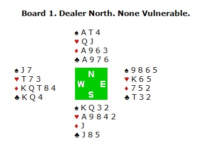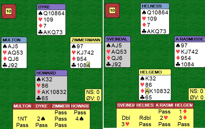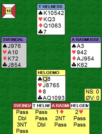Ved de fleste bord åpnet nord med 1NT og syd meldte 2ru, overføring. Den doblet vest og så kom nord i 3NT. Utspill ruter 2, norske utspill. Nord stakk ruterdame med esset og spilte hjerterknekt som har fikk for. Mer hjerter til konge og ess før hjerter 9 godspilte fargen. Vest kom inn og fortsatt med en sleip ruter 4. Hva gjør nord med den? Øst har tre stykker og er det 1072 eller 1052 skal han legge liten og fargen er blokkert. Har han 872 eller 752 må spillefører opp på nieren. Tøft motspill av vest, men Steingrim Ovesen hadde ingen problemer med å klaske i nieren og notere 10 stikk. Ser du hva vest kunne gjort for å gjøre ting enda verre? Jo, ruterkongen første gang. Når han så spiller den lille etterpå, vil nord med all sannsynlighet plassere øst med D82, D72 eller D53. Han legger liten for å blokkere fargen, men vips så blir det en beit. Sikkert ikke mulig i praktisk bridge. I alle fall ikke uten å tenke så mye at han avslører seg. Kanskje er heller ikke K108xx god nok ruter til å doble overføringen? _________________________________________________________