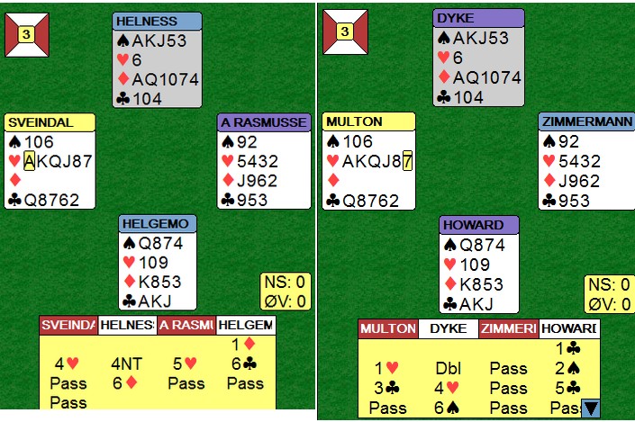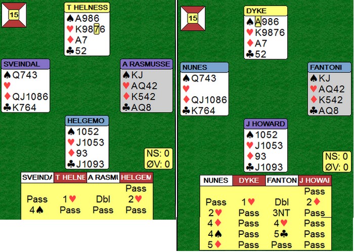 Flere som sliter med konvensjonene? Godt å se det er flere enn meg som slilter med å huske. Når Fantoni - Nunes kan gjøre slike feil, er det håp for oss andre. 2sp med tre sonebeit når 4hj er til å slenge i veggen er ikke bra. Tor og Geir kommer i en steinhard 3NT, men hadde vest hatt hjerteresset måtte Noralia klart å cashe fire ruterstikk. Nå ble det fire sonebeiter til tross for at EKD i ruter felte knekten. Jon Sveindal fant hjerterskiftet i stikk fire!! Noralia leder 59 - 45 med fem spill igjen !! Jeg må (dessverre) skrive om de dårlige spillene også. Igjen må jeg stille spørsmål ved bergensernes vurderinger i meldingsforløpet 2NT er krav og kan inneholde mange hender. 3ru skjønner jeg ikke fra Arild Rasmussen, men det er mulig det betyr noe. Ellers ser det rimelig opplagt ut å støtte kløveren til 3kl. 5ru fra Jon var vel også overilet? Det kan enda være mange mulige endestasjoner utenom 5ru. Til 5ru kan dere alltids komme seinere, men "feilen" må være 3ru. Helt sikkert en konvensjonell melding som en av dem har glemt. Dette er en screeshot fra det øyeblikket Jon Sveindal legger ned blindemann i 5sp. _____________________________________________________________________________ Tre spill igjen: 65 - 57 til Noralia Det skjedde ikke noe dramatisk i de tre siste og dermed er en liten sensasjon fakta. Takk og farvel til Monaco og lykke til videre for Noralia.