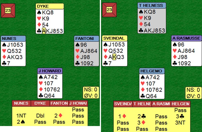 Jeg har fulgt Jon Sveindals kamp mot en alvorlig sykdom i lang tid. Prognosene hans i fjor på denne tida var ikke oppløftende, men god behandling og et livsmot mange av oss burde misunne han, gjør at Jon ser bedre ut enn på lenge. Han er på langt nær frisk, men forteller at han tar dag for dag og gjør det beste ut av tilværelsen. For oss bridgespillere betyr det i praksis å spille kort, noe bergenseren gjør med stil enda. Her i Tromsø spiller Jon Sveindal med sin tidligere landslagsmakker, Arild Rasmussen. De har australske lagkamerater og tok seg med et nødskrik til Round of16, etter 15.plass i innledende kvalifisering. I sluttspillet var det tøff motstand allerede i første kamp, med Monaco som opponent. Helness-Helgemo, Fantoni-Nunes og Zimmermann-Multon er favoritter i alle kamper de stiller opp i, men ingen lag er uslåelige. Derfor gikk Noralia til verket med åpent sinn og allerede i spill 4 henta de 14 IMP på en spektakulær måte. Jon Sveindal bestemmer seg for at det er NS som har mest kort og sperrer med 4hj. Et praktisk bud som gjorde det umulig å finne sparfargen for Tor og Geir. 6ru er en glimrende kontrakt, men 4-0 sits kan selv ikke Geir Helgemo håndtere. På det andre bordet melder Multon inn en mer normal 1hj og da kom sparen på banen. 6sp er den samme beita som 6ru, selv med kløver ut fordi det er den femte ruteren som forsvinner. Multon ser ikke dette og starter med hjerter 7 (!) for å få inn makker og en ruterstjeling. Det er ikke ofte en som spillefører får det tolvte stikket i en slem med 109 mot 6 singel i første stikk. Spill 9 Dette var et spill der en må passe på forbindelsene. Det kom kløver ut og Jon gjorde rett når han stakk opp på esset. Prøver han kappen kommer det ruter gjennom kongen og kontrakten er beit i stikk tre. Etter kløveresset la Jon ned spar ess og gikk så på hjerteren. Hjerter ess, hjerter konge (bort med en ruter) og hjerter til stjeling. Ingen dame kom ramlende. Spar til bordet og ruter mot kongen. Nå ble det beit med to rutertapere, kløverkongen og spardame. Vinnende spilleføring er å gå på hjerteren med en gang etter kløveresset. EK i hjerter og hjerter til stjeling, spar til esset og hjerter. Syd kan ikke vinne noe med å stjele med orginalstikket sitt i spar, så han kaster et kort. Etter hjerterstjelingen spilles bordet inn på den andre sparhonnøren og på den trettende hjerteren forsvinner enda en ruter. En taper i kløver, ruter og spar. Om den siste planen er bedre enn den Jon valgte, klarer ikke jeg å regne ut eksaktlig. Rører en ikke trumfen kan det fort ble en stjeling med noe som ikke er et orginalt sparstikk. Jon sin spilleføring vinner med Dxx i hjerter eller ruteresset foran. På den annen side er vest alltid hjemme om hjerteren sitter 4-3 med lengden bak vedf IKKE å spille spar i stikk to. Han tåler uansett ikke spar D10xx, så hvis syd ikke har den fjerde hjerteren, stjeler vest og henter den trettende med sparkongen som inntak. Skulle syd ha den fjerde hjerteren, kan vest stjele med sparknekten og vinner igjen hvis den holder. Multon vinner 4sp ved å ikke røre sparen før han går på hjerteren. 12 IMP til Monaco. Hissig på grøten? Jeg vet ikke hva en skal si om NS sine meldinger i dette spillet. Moderne bridge er aktiv og en melder inn på høy og kaniner (er det noe som heter det?). Legg merke til Zimmermanns pass første gang. Han har ingen god melding uten spar hold og uten hjerter, så han legger seg i busken. Syd var nok redd øst satt på en straffepass med spar og prøvde å redde makker. Zimmermann ville doblet alt som kom, i alle fall 2ru. Det ga den nette sum av +1100. 12 IMP mot 3NT 11 på den andre bordet. De melder som.. I forrige spill antydet jeg at australienerne meldte hardt når de gikk 1100 i beit. Det går ikke an å kritisere ett og ett spill, fordi i spillet under tar de IMP'ene tilbake. Sveindal - Rasmussen går tre sonebeiter i 3hj og har nok forberedt seg på et tapsspill, men så skjedde ikke. 4sp er steinhardt mot en sterk NT i vest. Ingen makt i verden kan beite 4sp, selv med hjerter ut. Jeg skal selvsagt ikke lære Tor Helness å melde, men jeg hadde meldt 1sp istedet for å redoble. _________________________________________________________________________________ Justin Howard & Kieron Dyke - Noralia og Australia Spill 13: God slem av Multon - Zimmermann Multon måtte kappa opp ruter 10 i nord for å vinne, men det gjorde han selvsagt ikke. 6NT er en flott kontrakt som avhenger at enten sparen eller ruteren ordner seg. Sveindal - Rasmussen stopper i 3NT og vinner litt heldig 13 IMP i stedet for å tape omtrent det samme. En småfin ledelse til Noralia etter 14 spill. More to come!! ___________________________________________________________________