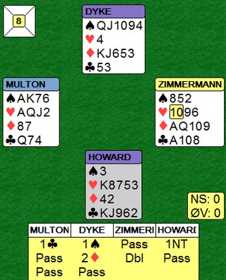 Norge/Australia hadde en liten ledelse etter de første 14 spillene, men i andre halvrunde satte Zimmermann inn begge F16-jagerne sine. Kunne Jon og Arild med venner holde unna? Spill 1 Skal du holde unna, Jon, så må du ikke melde sånn i alle fall. Jeg mener vest hadde til en opplagt 4hj i stedet for 4sp for å be makker velge utgang. Han som dobler opplysende har normalt sparfarge, men det er bare hvis han er i området omkring en vanlig åpningshånd. Arild Rasmussen planla å vise hånda som en balansert 18-19, og jeg kan ikke se at han skulle meldt noe annet enn pass over 4sp. En unødvendig utgangssving vel? Nerver inne i bildet? I spill 1 kom Jon og Arild i 4sp på 4-2. Det har neppe skjedd siden Koreakrigen, i alle fall Vietnamkrigen. Noen spill seinere bommer de på NT-intervallene og havner i 3NT med 12 mot 9 hp. Tor dobler, men Geir oppfatter det som spar ut (bordet "meldte" farge). Så finner Arild ruteren ved å kappe på nieren og får fem stikk der. I sluttspillet forsvinner enda et stikk og Noralia berger med en beit (!) for -200. Likevel en syver ut med 2sp N 6 stikk på det andre bordet. Stillingen i kampen: Monaco - Noralia 44-42.