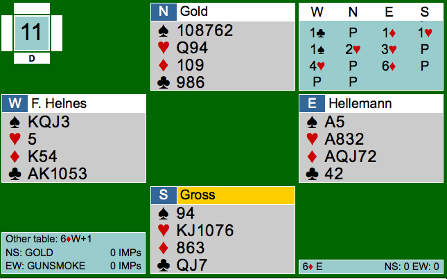 Det helnorske laget (jo, Tor Helness er norsk!) ligger fint an til å klare å bli blant de seksten lagene som går videre til sluttspillet. Her er to spill fra femterunde-kampen mot Gold fra England, og begge er med Anne-Lill Hellemann og Fredrik Helness. Paret har avtalene på plass mot sperremeldinger og den er slik: "Man sperrer ikke mot sperr". Det betyr at 4sp viser gode kort, omtrent ni stikk vil jeg anta. Etter pass fra syd i posisjonen under meldte Fredrik 5kl og viste fram renonsen sin. Det var mer enn nok for fru Hellemann som hoppet til 6sp. 11 IMP inn da engelskmennene stoppet i utgang på det andre bordet.