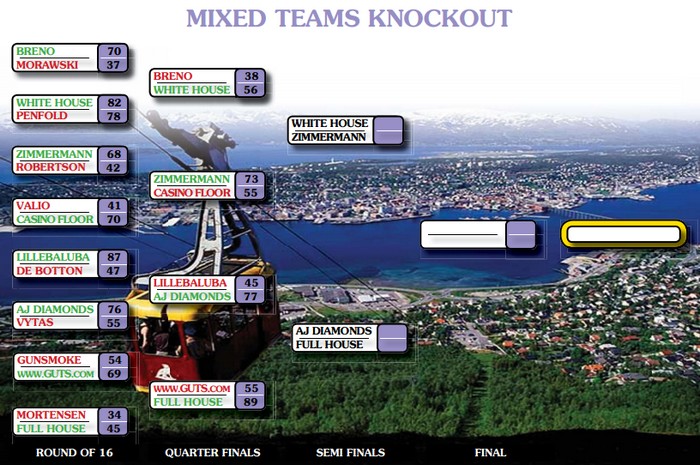 Jeg fikk sett en del av den første sesjonen av kampen mellom norsk/svenske GUTS.COM og svensk/amerikanske FULL HOUSE i kvartfinalen. Det var lovende takter av de norske og ledelse med 41-32. For de andre to norske eller halvnorske lagene så det mørkere ut. CASINO FLOOR (Thomas & Hoffa) r hadde fått bank av Zimmermann, mens LILLEBALUBA (MO BK) lå godt bak sin motstander. I andre sesjon gikk det ikke så bra for Pernille LIndaas og venner. FULL HOUSE ble for sterke og derfor hasta la vista eller "takk og farvel" som de ikke fullt så språkmektige ville sagt. Her er resultatene.