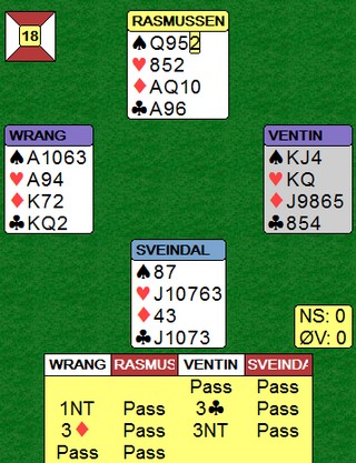 De fjernet plutselig SLUFSA fra BBO. Det er sikkert fordi noen av de høye herrer har blitt visket i øret hva slufsa egentlig er. Jeg er alt for blyg til å fortelle det til dere. SPILL 18 Her skulle Ventin safespille ruteren for å beskytte kløver KD, men denne gangen var det ikke løsningen. Arild Rasmussen fikk en gavepakke han ikke trodde på og sendte 3NT tilbake med hjemgang. 3kl var Puppet Stayman, mens 3ru fortalte om minst en firekort major. Spar ut til tieren og mer spar til knekten. Så kom en litt underlig ruter knekt fra bordet. Det er rett med damen i syd, men ikke denne gangen. Arild vant med damen og skifta til hjerter. Mer ruter til konge og ess. Mer hjerter. Nå ser du sikkert for deg bordet med 985 i ruter, spar kongen singel og 854 i kløver. Tror du ikke Fredrik Wrang spilte kløver i stedet for å godspille ruteren sin! Arild stakk kongen med esset, men trodde ikke at spillefører kunne spille på denne måten uten tettere kløver. Mer hjerter og nå ble ruteren godspilt. 9 stikk (som alltid var der) Hadde Arild spilt en kløver til etter esset, ville det bli minst en beit. Spar som fjerner kongen hadde vel også holdt? Noen ganger er en gave en gave og da skal en bare bukke og takke, hr. Rasmussen.. Gave tilbake til Ventin