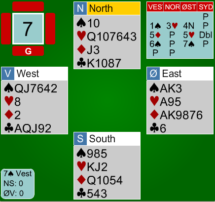 LIVESCORE KVARTFINALE I lagbridge er det de store spillene som avgjør og dette er et sånt et fra kampen mellom GUTS.COM og FULLHOUSE. Norske Pernille Lindaas og Jørn Arild Ringseth sitter ØV og melder seg opp i en absolutt spillbar 7sp. Jeg skjønner godt at Jørn i øst melder storeslemmen og var ikke spesielt heldig med makkers single ruter.