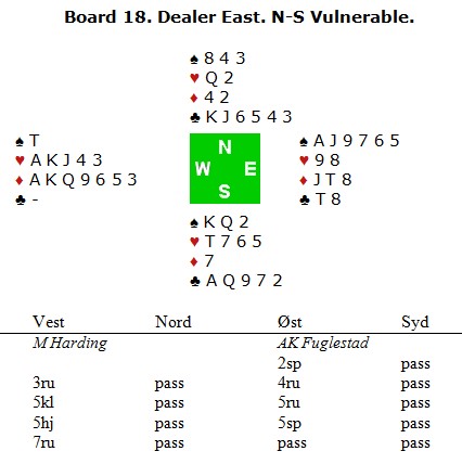 Jeg har sagt det mange ganger. Lagbridge er "Bidders game" og de som behersker de store spillene havner alltid langt der oppe. Her er Ann Karin Fuglestad og Marianne Harding i aksjon. Karl Christian Baumman, Ann Karin Fuglestad, Marianne Hardig og Simon Eileraas. __________________________________________________________________________ 2sp er svake to og så er det om å ha avtale i orden. Ny farge er krav og Ann Karin støtter med støtte. Marianne legger en fin plan framover og cuebidder 5kl. Hun "vet" at makker går ned i 5ru, med da har hun planlagt å komme tilbake med 5hj for å tvinge fram cuebid av sparesset fra makker. Melder hun 4hj og får 4sp, er vi vel ikke 100% sikker på at det viser esset? 5sp er ALLTID esset. Glimrende meldt og tenkt, Marianne Harding!!