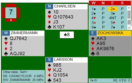 Det å lure motparten er en del av bridgen og når en går rett på limpinnen, må en bare bøye seg i hatten!! Thomas Charlsen spilte ut kløver åtte etter dette meldingsforløpet og da gikk 7sp lett hjem. Med et annet utspill går kontrakten fort beit, i alle fall fikk over halvparten av spillerne ikke mer enn 12 stikk ved å gå på ruteren. Det jeg videre skriver er referat fra loggen på BBO. Når Charlsen så Zimmermann sine kort, lurte han på hvorfor han ikke hadde cuebiddet 4kl eller 4ru? Zimmermann svarte i følge referatet på BBO. "No agreement. I wanted a club lead" Det var akkurat det han fikk og da burde samtalen sluttet her fordi det er helt opplagt at Zimmermann av taktiske grunner har hoppet over to (!) farger han har kontroll i. Makker i øst forklarte det som et normalt cuebid og hun meldte deretter. Selvsagt oppdaget hun at makker hadde kløveresset etter 4NT, men det måtte hun vel ikke si noe om? Neda. Det var ikke slutt. Turneringleder ble tilkalt og diskusjonen fortsatte. TL ga Zimmermann medhold i at alle meldinger skal være deklarert, men meningen med alle meldinger trenger selvsagt ikke forklares. Det kan da ikke vært forbudt å være smart På BBO ble det skrevet at NS ville appellere. Det får jeg for guds skyld ikke håpe skjedde. Da ville i alle fall jeg rødmet. Enda verre hvis det ligger en antydning i at 4hj var avtalt som en mulig melding over 3sp. Da er det i tilfelle (minst) uetisk og lista skal ligge himmelhøyt for å antyde at motpartens forklaringer ikke stemmer med avtalene. La det være klart. Alle bridgespillere kan melde akkurat hva de vil, så fremt makker ikke oppfatter ting på noen annen måte enn etter systemet. Ønsker du å åpne med 3sp på 18hp og gående farge, kan du selvsagt gjøre det. Men ikke mer enn en gang eller to hvert skuddår. Ønsker du å hoppe over cuebid eller cuebidde en farge du ikke har kontroll i, kan du selvsagt gjøre det såfremt makker ikke vet mer enn motparten. Det gjelder egne regler for åpningsmeldinger.Å åpne 1sp i tredjehånd med EKxxx i fargen og slutt, er ikke tillatt fordi det regnes ikke som bløff, men et avvik fra eget system og du vil gjøre det samme frekvent i samme posisjon andre ganger. Du kan heller ikke strekke 8-12 NT til 7 hp og i f.eks Ekrens er det påbudt å ha hender som passer til definisjonen. Grunnen til de to siste tingene, er at konvensjonen er destruktiv i utgangpunktet. Pierre Zimmermann lurte Thomas Charlsen opp på tribunen