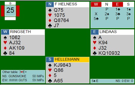 men ikke denne gangen. 4hj viser kortfarge og flytt makker sin EK i hjerter til minorhonnører så er 5kl rett kontrakt. Gi makker kløveresset og ruteresset, så står 6kl mens 3NT er beit. Kløver ut til esset og ruter til ED. En beit og 11 IMP ut mot 3NT - 11 stikk. Jeg vet ikke, men kanskje er 3ru en like god melding som 4hj, Gunn? Tredje farge viser hold og da får makker omtrent den samme informasjonen om at hjerteren er øst sitt svake punkt. Dere er enda under 3NT og har ikke brent de samme broene som 4hj gjorde? Likevel, maks uheldig da!! ____________________________________________________________________________