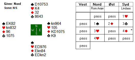 I åpent rom spilte Mæsel-Mæsel (N/S) mot 4 spar som ble vunnet akkurat. Polens nord åpnet med en svak grand, og Bakke (øst) doblet som straff (sterkt)). Etter to passer redoblet nord, åpenbart for at de skulle rømme til et bedre sted, men syd passet! Mot 1 grand redoblet spilte Bakke ut tre store ruter og fortsatte med en fjerde runde av fargen så hans femte ruter ble godspilt. Spilleførers beste plan nå ville vært å ta fire kløverstikk og fri seg i hjerter i håp om å få et sjette stikk og gå to, eller kanskje "kun" en redoblet bet. Da han tok bare to runder kløver og forsøkte spar til kongen ramlet taket i hodet på han. Bakke stakk og tok ess-konge i hjerter og det godspilte ruterstikket, så spar gjennom syds knekt til tieren og damen. På det siste sparstikket måtte nord holde enten kløver ess eller den nå godspilte hjerter dame. Nord får være litt unnskyldt, stort mer uinspirerende kontrakt skal man lete lenge etter. Så han fulgte ikke med på hva Farstad kastet underveis (bare husket at vest hadde en haug med kløver fra start), så med to kort igjen kastet han hjerter dame og holdt kløver ess, men Farstad tok da for hjerter knekt i siste stikk! Fire redoblet bet i sonen, og det ga 18 IMP til Norge.