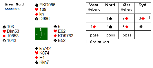 Tor Helness i øst spilte 5 ruter. Utspill spar til damen og skift til kløver til knekten. Ny spar ble stjålet og ruter dame fikk beholde neste stikk. Dermed var et ekstra stikk sikret! Liten hjerter og syd måtte legge lavt slik at damen fikk stikket. Deretter ble syd spilt inn på trumfesset Han måtte spille kløver for å presse ut esset før kløvertaper forsvinner på 4.hjerter. Han valgte kløver konge, men da stakk Tor med esset og tok hjerter ess før nord ble spilt inn i kløver og måtte spille til dobbeltrenons. Det hjelper heller ikke å spille liten kløver til damen. Da tas selvfølgelig ikke hjerter ess, og ny kløver vil føre til at syd blir innspilt. Dermed kun 300 ut mot 650 på andre bordet og 8 imps til Monaco.