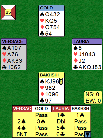 Syd spilte ut spar til esset, og Lauria trumfet en spar med det samme. Så to runder trumf og nok en spar til stjeling fulgt av hjerter knekt som fikk løpe til Golds (nord) sin dame. Nå burde Gold slik det satt spilt spar til dobbeltenons. Da måtte øst ha stjålet med sin nest siste trumf og kastet hjerter fra vest. Men han ville da hatt igjen kun en trumf og ville ikke fått både avblokkert hjerter ess, kommet seg hjem for å trumfe god hjerteren og også hentet den godspilte hjerteren. Så spar tilbake i den posisjonen beter. Men Gold spilte ruter. Da vant Lauria med ruter knekt og hadde elleve stikk. Han fortsatte med hjerter til esset før han tok de to siste trumfene. Før den siste så det slik ut: