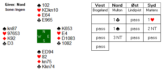 Mot 3 NT spiller Øst ut hjerter som lasjeres to runder. Sp 10 seiles til Vest sin knekt, men 4. taper kommer da i hjerter. 9 stikk er alt som oppnås i 3 NT, men alle de som spiller med ruter som trumf får overstikk og slør dette.