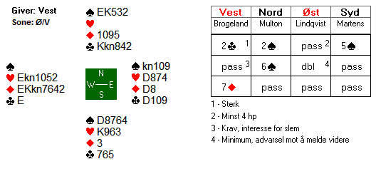 Det innebar at Brogeland måtte gjette om det sto storeslem eller ikke med ganske begrenset informasjon om makkers kort. Han valgte å gå for gull, men det ble ikke riktig da hjerteren satt såpass surt.