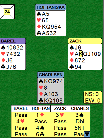 Åpneren hadde 13 HP, men da 11 av de var i feil farger i forhold til hva nord ønsket var det en latterlig storeslem som dog kunne vært nedlegg med bare 4HP hos syd - hjerter Ess..
