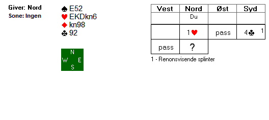 Du åpner med 1 hjerter som lover minst 5-kortsfarge. Makker hopper så til 4 kløver. Det er en såkalt splintermelding som viser hjerterstøtte og renons i kløver.