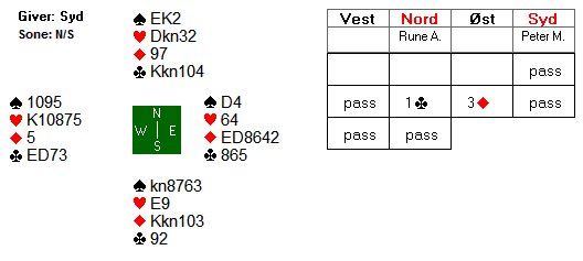 Thor-Erik Hoftaniska startet med kløver 9, og selv om spillefører la lavt i bordet var han sjanseløs: Vest trumfet og tok for hjerter Ess, som Øst droppet Damen på. Så en liten hjerter til knekten og ny kløverstjeling. +200 til Ø/V som ikke kan klare mer enn 10 stikk i ruterkontrakt.