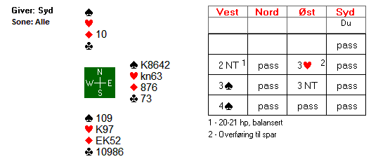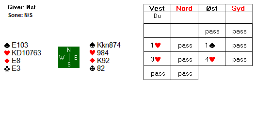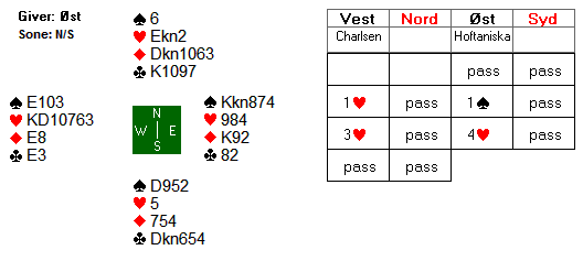 Skjønt, riktig og riktig. De fleste var i 6NT i nord i dette spillet, etter 1 hjerter-åpning i syd (syd er giver). På svært ubalanserte hender er det oftest å foretrekke å spille farge-kontrakt, men så er det dette med parturnering da, og som dere ser går både 6NT og 6 hjerter hjem med den normale 3-2-sitsen i hjerter i mot, og 4-3 i mot i ruter. I hjerterslem håndterer du også enda skjevere sits i ruter.