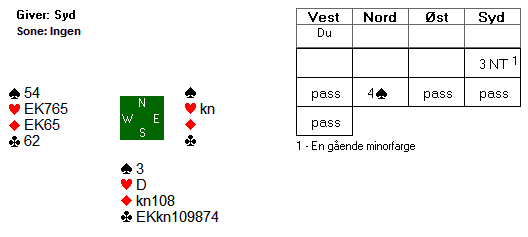 Makker spiller ut hjerter knekt mot 4 spar i nord etter at syd har vist en gående minorfarge. Du vinner første stikk med kongen i vest, mens spillefører følger med toeren. Hvordan planlegger du motspillet?