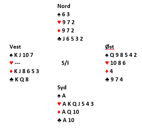 Den interessante kontrakten er 5 hjerter som kun noen få sydspillere fikk forsøke seg på.