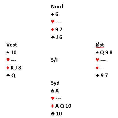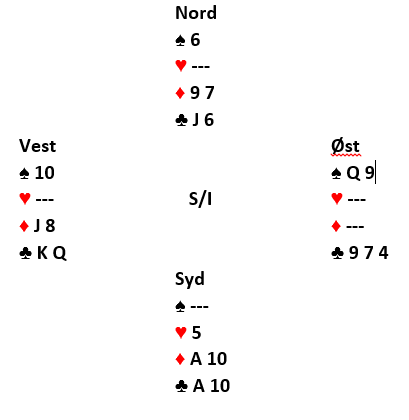 Det kan imidlertid ordne seg med kløver konge i utspill også, men da på en litt annen måte. Syd vinner med esset og spiller hjerter en lang stund. I dette tilfellet tar han alle hjerterne. Etter det er det fem kort igjen, og det ser slik ut: