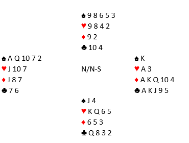 Legg merke til at spar knekt sitter dobbel. Så det er fire sparstikk å hente, men nord stopper den femte sparen. Så spillefører vil med fire stikk i spar kun ha tolv stikk om han ikke får seg kløverstjeling hos vest. Og tar han kløverstjeling så kan han ikke lenger få tatt ut trumfen og hentet sparstikkene (det blir ikke igjen noe inntak til vests spar).