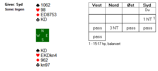 Aktuelt spilte Kristian hjerter ess og hjerter til dama. Da syd var utstyrt med K103 ble det to hjertertapere og ei beit i kontrakten. Hele spillet så slik ut:
