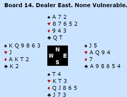 Dagens tristeste historie var kanskje det som skjedde på mitt bord. Makker Michael Ware har spilt meget bra så langt, men her var han ikke på høyden. Dette skjedde i kampen vi vant klart mot Skottland, men uten feilen i dette spillet ville det blitt enda større seier. Mot 6 spar spilte jeg ut ruter (spillefører hadde vist kortfarge i hjerter, og det var kjent at det lå lang kløverfarge hos blindemann). Spillefører vant det stikket og kunne altså vunnet kontrakten på flere måter. Men skotten spilte spar til knekten og mer spar til mitt ess. Han tenkte nok at trumfen måtte tas ut så skulle han spille god kløveren senere med en stjeling. Men da glemte han nok at det var helt opplagt å skifte til hjerter som tar bort inntaket til blindemann, da kan ikke kløveren utnyttes. Inne på trumfesset skiftet jeg til hjerter 2, alltid fordeling etter å ha fått ett stikk allerede i slem. Vi bruker imidlertid invitt inne i spillet i omtrent alle andre situasjoner, og Michael fikk for seg at jeg hadde spilt invitt, altså hadde jeg knekten. Da spillefører etter litt betenkning kom på at nå var det ikke så enkelt lenger (han hadde bare ti toppstikk nå) måtte han ta hjerterfinessen og la liten fra bordet. Så gikk makker i boks. Han hadde spilt lynhurtig (og godt) i alle spill så langt - ingen feil. Så kom en lang tenkeboks, og da han kom ut av den la han hjerter 10! Det er nok en klar feil, for om spillefører var renons i hjerter så ville han nok heller ha forsøkt gratisfinessen, og dessuten er hjerterspillet mitt fordeling i en slik situasjon (hjerter 2). Spillefører hadde imidlertid kun elleve stikk selv om han nå fikk for hjerter knekt. Men så fikk Ware resten av sparstikkene i panna, og da ble han skviset sønder og sammen. En lekker liten bet som altså var bare å ta slik spillet gikk ble forvandlet til en nitrist 980 ut, en grusom dobbelsving siden våre lagkamerater hadde stoppet i utgang.