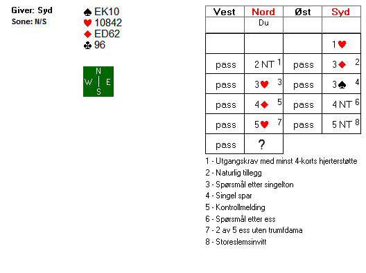 For Norges damelag satt Liv Marit Grude i nord. Da makker Bodil Nyheim Øigarden bekreftet at alle nøkkelkortene var på plass fant hun en genial melding. Hun byttet rett og slett trumf og hoppet til 7 ruter. Hun ser at man kan kaste nords kløvertaper på den femte hjerteren i ruterkontrakt.