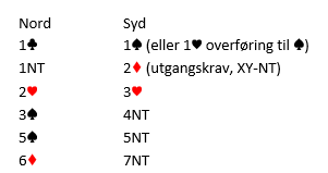 Alternativ kunne syd hoppet til 3H over 1NT, noen bruker det som 5-5 og sterke kort. Da vil nord kontrollmelde 4 ruter (hjerterstøtte, 3 spar ville vist sparstøtte), og syd finner frem på samme måte via Key-Card BW.