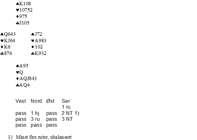 Oppdateringene foregår ikke så jevnlig som vanlig, men jeg håper at du allikevel stikker innom sida en gang i blant. Forhåpentligvis klarer jeg å komme opp med minst én ny oppdatering hver uke, sjøl om det har sviktet litt i det siste. Normalt er det enklere å finne gode spillepoenger i spill jeg sjøl har deltatt i, så når jeg er borte har jeg som oftest ikke så mye å ta tak i. Løsningen kan være at dere tipser meg om spill! Vi kan la det være en konkurranse fram mot jul (gjelder uansett hvilken klubb du tilhører): Beste tipset får spille med meg en gang til sommeren. Det må da vel være noe? En sjelden god sjanse for å gå ei bet for mye i ei alt for hard kontrakt.