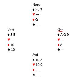 På kløver 10 var nord ferdig mann. Hvis han kastet ruter dame ville spillefører få ruterstikk - det tiende - og sparfinessen ville gitt kontraktstikket. Nord valgte å kaste en spar. Da forsvant ruter 8 fra øst, og avslutningen ble spar til damen og spar ess. Østs spar 9 var blitt til stikk - det ellevte.