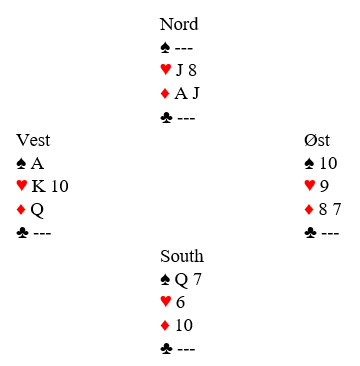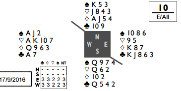 Idet det ble spilt spar til esset i diagramsituasjonen ble nord utsatt for et valg av type pest eller kolera. Hvis han kastet en hjerter ville vests konge felle knekten - ti stikk. Hvis nord kastet ruter knekt ville han bli innspilt på det da single esset for å være nødt til å spille hjerter rett opp i saksen - også ti stikk. Nord så at ingen av de avkastene ville hjelpe og satset på at syd hadde ruter dame. Så han kastet ruter ess, men da ga vests ruter dame det tiende stikket. Pluss 630 var verd 92 %, eller 46 matchpoeng. Kunne Auken-Welland få godt over middels (39 matchpoeng) i siste spill slik at de sikret seieren?