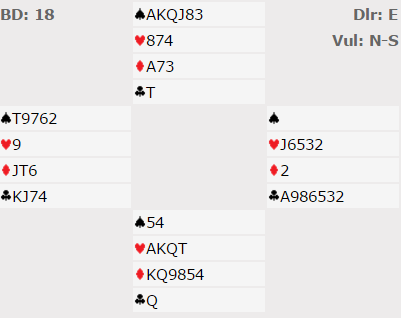 Syds dobbelton i spar var deilig å se, og helt nødvendig. Etter kløver ess skiftet øst til ruter til kongen. Så spar 4 fra bordet. Da vest la liten var det bare å seile fireren (følge på med treeren) eller ta den rådype finessen med åtteren, for vest har nok alle fem sparene! Dermed kunne det forlanges resten, vunnet slem doblet og +1660 etter den dypeste finessen jeg har tatt på noen år, og jeg klarer neppe å slå den rekorden i 2017 i alle fall. Det hjelper ikke vest å gå inn med spar 9 eller 10 i første trumfrunde. Da avslører han bare sitsen enda tydeligere, og det vinnes med honnør hos nord over "stor" spar fra vest, så hjerter til syd og spar til åtteren.