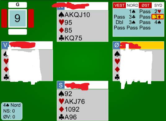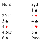 Utrolig nok var der nord som hadde til å doble... Syd spilte ut kløver, og for å gå bare 1 beit, måtte jeg nå ha stjålet utspillet, og etter å ha sett ruteren 4-0, tatt for hjerter ess, før jeg spilte syd inn igjen i trumf. Han måtte da ha spilt hjerter/kløver slik at jeg fikk kastet to spar i bordet. Nord kastet uansett fra seg en spar på ruteren, så da ble det med en beit.
