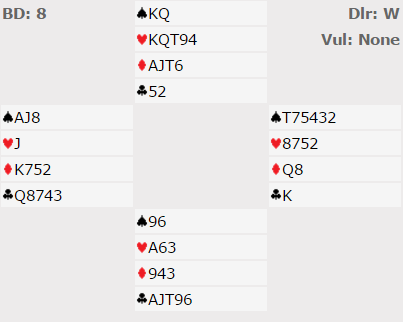 Du sitter syd, og etter å ha gjenmeldt sparen din noen ganger, og inspirert makkeren din til å spørre etter ess har du kommet i den lett psykotiske kontrakta 6 sp! Ut fra vest kommer liten hjerter, og nå er det din tur: